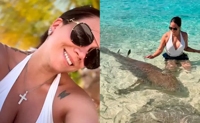 A través de una publicación, la empresaria compartió imágenes donde está en la playa la lado de tiburones, que son parte del atractivo turístico de la zona. La artista afirmó sentirse llena de adrenalina que hace sentirse viva.