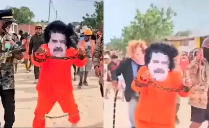 La escena se dio en medio de una celebración popular, donde la música, los pasos típicos y el ambiente festivo se mezclaron con una representación que sacó carcajadas y aplausos entre los asistentes. Sin perder la esencia de la danza, los participantes incluyeron gestos y movimientos que aludían a la captura del exmandatario venezolano.